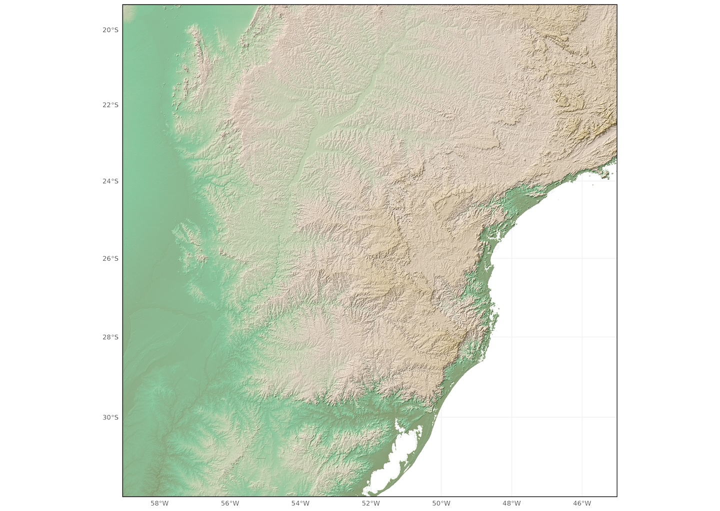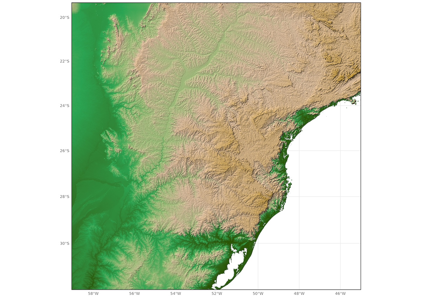 Cue a disproportionately long adventure, involving at least one GitHub issue submission, to figure out how to acheive that polished, QGIS blended look, whilst staying (mostly) within the warm, fuzzy embrace of the R ecosystem. Fortunately, I did eventually discover how to reach this state of nirvana using {ggblend}, though it was hardly pretty. See below for brief summary of journey using SRTM elevation data for southern Brazil. First, we revisit the issue of using just transparency to blend the elevation and hillshade layers: