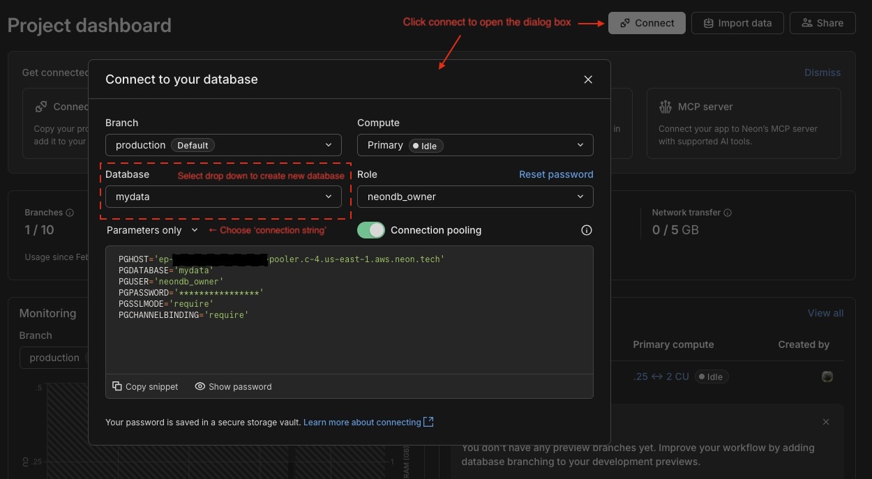 First thing first, you'll need to sign up for a free account on Neon and create a new project using the web interface. From the project dashboard here, you can create a new database by hitting the "Connect" button and then selecting 'Create new database' in the drop down select menu.