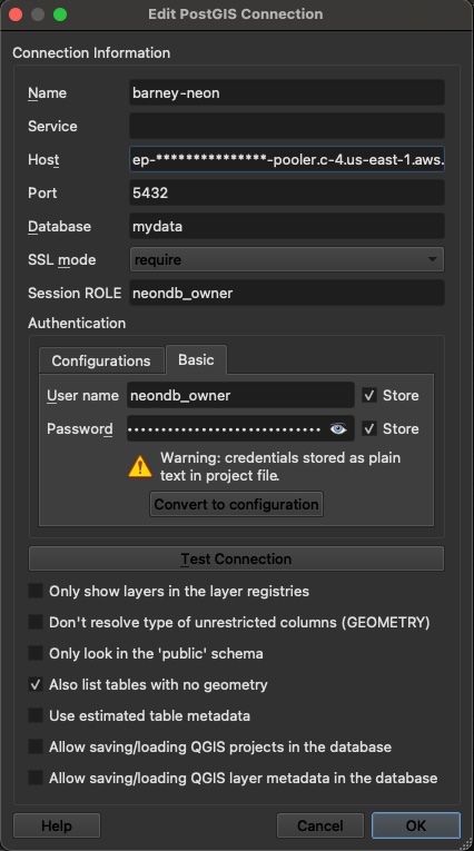 For now, we will load up QGIS and connect to our new database using that. Add a new PostgreSQL connection by right-clicking on PostgreSQL in the Browser window and selecting the option. You'll be faced with a connection dialog box which you should be reasonably comfortable filling out using the information provided from the Neon "Connection string" output, discussed above. You can call the name of connection whatever you like, perhaps something like 'My Neon DB' would be suitable. All good, except if you are using QGIS 3.40.5 or earlier (or later, I haven't yet checked) you will need to make a change in the password field, because otherwise you will encounter a connection error about the endpont not being specified. Credit to Neon for putting together that very helpful help page describing this issue and its various solutions. Given I can't find any way to cleanly specify custom database connection parameters from QGIS, I had to adopt the dirtiest workaround given: prepending the endpoint address to the password within the password field, using the format endpoint=[endoint];[password]. You can find your endpoint address just after the "@" symbol in your connection string and it will start with ep-. Bang that in, set SSL mode to require, and I also like to check 'Also list tables with no geometry'.